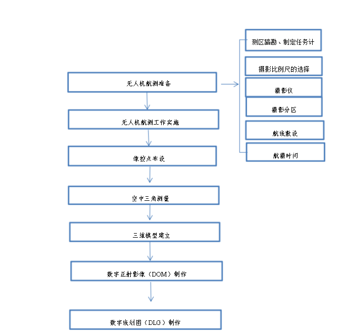 方案设计是进行无人机航测工作的基础,也是无人机航 测工作得以有序进行的保障。无人机航测方案设计与传统的 航空摄影测量方案设计有相似的要求,但也有自身的特色。 本章在无人机航测基础理论的基础上,根据选取的无人机系 统平台的特点,系统地设计了无人机航测方案,对无人机航 测准备、无人机航测工作实施、像控点布设、空中三角测量、 三维模型建立、正射影像、数字高程模型及数字线划图的生 成等方面进行了详细的规划,并对各部分的关注重点进行了 解析。方案设计整体思路如图 3.1所示: