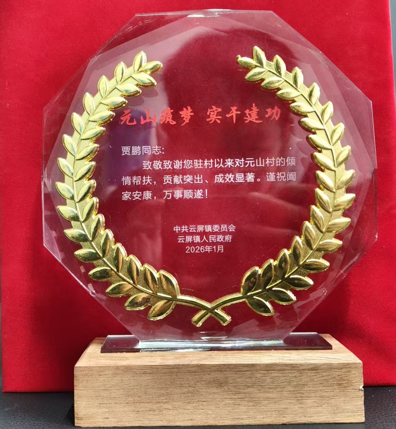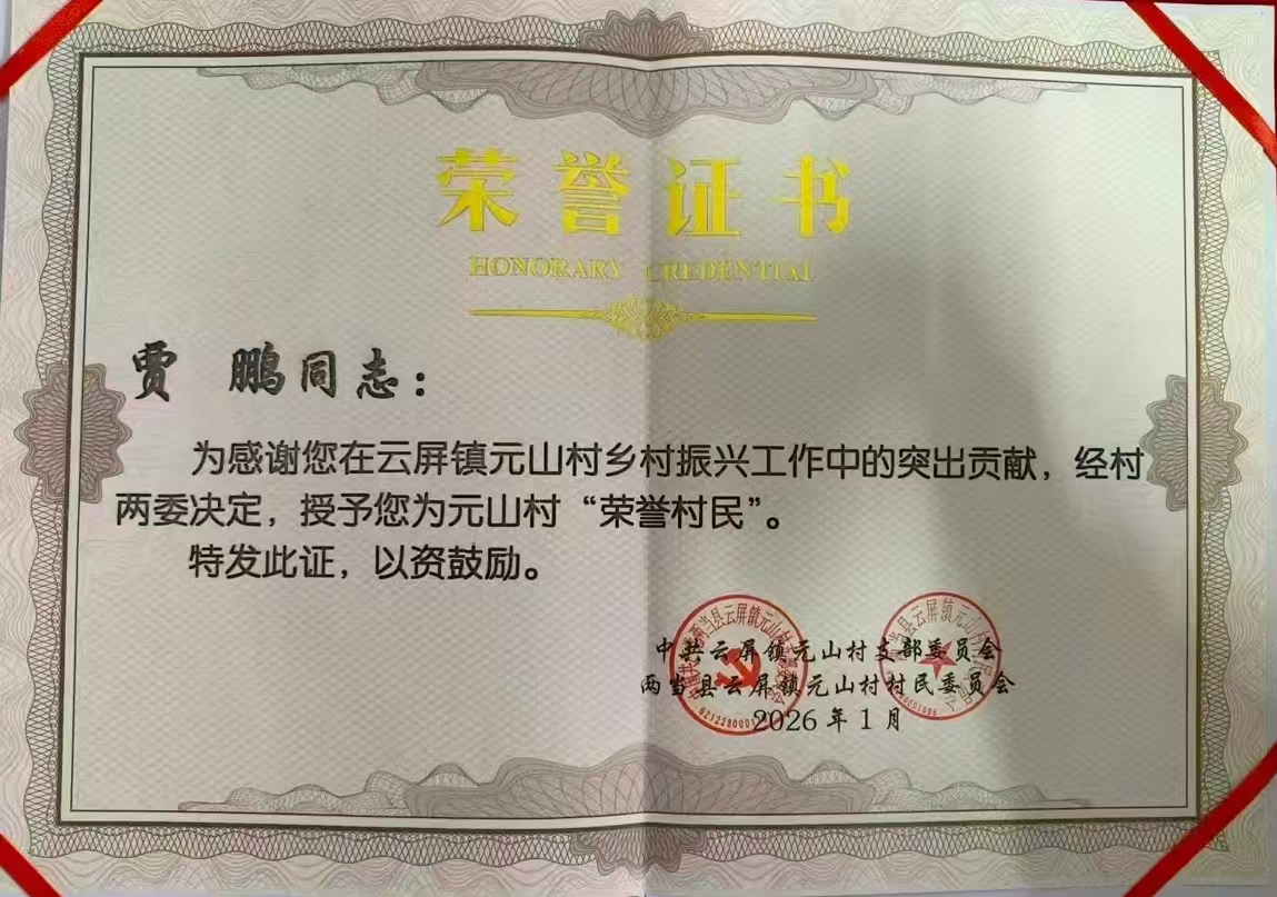 在两当县云屏镇元山村的田间地头、农家院落,总有一个步履匆匆的忙碌身影。他,就是省有色地勘局派驻元山村的第一书记、帮扶工作队长贾鹏。作为天水矿产勘查院的科级干部,自2023年9月驻村以来,贾鹏始终牢记组织重托,怀揣对乡亲们的赤子情怀,弘扬“甘肃地勘”精神,以党建为引领、产业为核心、科技为支撑、民生为根本,在巩固拓展脱贫攻坚成果与乡村振兴有效衔接的征程上躬身实干、砥砺前行。他用一件件惠民实事、一个个发展成果,赢得了村民的真心信赖与广泛赞誉。2026年1月任期届满之际,村民们送上“不忘初心担使命、驻村帮扶见真情”的锦旗,村“两委”授予他“荣誉村民”证书,镇党委政府颁发“元山筑梦、实干建功”奖杯,每一份荣誉都镌刻着他与元山村的深厚情谊,见证着他扎根基层的坚守与担当。