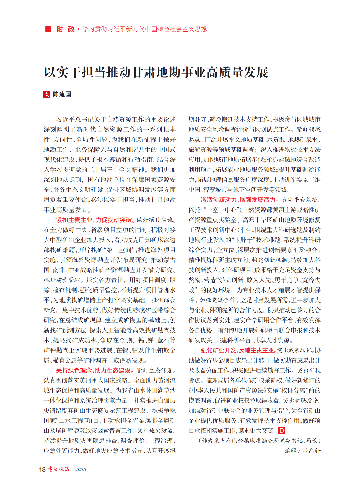 习近平总书记关于自然资源工作的重要论述深刻阐明了新时代自然资源工作的一系列根本性、方向性、全局性问题,为我们在新征程上做好地勘工作,服务保障人与自然和谐共生的中国式现代化建设,提供了根本遵循和行动指南。结合深入学习贯彻党的二十届三中全会精神,我们更加深刻地认识到,国有地勘单位在保障国家资源安全、服务生态文明建设、促进区域协调发展等方面肩负着重要使命,必须以实干担当,推动甘肃地勘事业高质量发展。紧扣主责主业,力促找矿突破。做好项目实施。在全力做好中央、省级项目立项的同时,积极对接大中型矿山企业加大投入,着力攻克已知矿床深边部找矿难题,开辟找矿“第二空间”;推进海外项目实施,引领海外资源勘查开发布局研究,推动蒙古国、南非、中亚战略性矿产资源勘查开发潜力研究。抓好质量管理。压实各方责任,用好项目调度、跟踪、检查机制,强化质量管控,不断提升项目管理水平,为地质找矿增储上产打牢坚实基础。强化综合研究。集中技术优势,做好传统优势成矿区带综合研究,在总结成矿规律、建立成矿模型的基础上,创新找矿预测方法,探索人工智能等高效找矿勘查技术,提高找矿成功率,争取在金、铜、钨、锑、萤石等矿种勘查上实现重要进展,在镍、钴及伴生铂族金属、稀有金属等矿种调查上取得新发现。秉持绿色理念,助力生态建设。紧盯生态修复。认真贯彻落实黄河重大国家战略,全面助力黄河流域生态保护和高质量发展,为我省山水林田湖草沙一体化保护和系统治理贡献力量。扎实推进白银历史遗留废弃矿山生态修复示范工程建设,积极争取国家“山水工程”项目,主动承担全省金属非金属矿山及尾矿库隐蔽致灾因素普查工作。紧盯地灾防治。持续提升地质灾害隐患排查、调查评价、工程治理、应急处置能力,做好地灾应急技术指导,认真开展汛期驻守、避险搬迁技术支持工作,积极参与区域城市地质安全风险调查评价与区划试点工作。紧盯领域拓展。广泛开展水文地质基础、水资源、地热矿泉水、旅游资源等领域基础调查;深入推进物探技术方法应用,加快城市地质拓展步伐;抢抓盐碱地综合改造利用项目,拓展农业地质服务领域;提升基础测绘能力,拓展地理信息服务广度深度,主动进军实景三维中国、智慧城市与地下空间开发等领域。激活创新动力,增强发展活力。夯实平台基础。依托“一室一中心”(自然资源部黄河上游战略性矿产资源重点实验室、高寒干旱区矿山地质环境修复工程技术创新中心)平台,围绕重大科研选题及制约地勘行业发展的“卡脖子”技术难题,系统提升科研综合实力,全方位、深层次推进创新要素汇聚融合,精准提炼科研主攻方向。构建创新机制。持续加大科技创新投入,对科研项目、成果给予充足资金支持与奖励,营造“崇尚创新、敢为人先、勇于竞争、宽容失败”的良好环境,为专业技术人才施展才智提供保障。加强交流合作。立足甘肃发展所需,进一步加大与企业、科研院所的合作力度。积极推动已签订的合作协议落到实处,建实产学研用合作平台,有效发挥各自优势,有组织地开展科研项目联合申报和技术研发攻关,共建科研平台、共享人才资源。强化矿业开发,反哺主责主业。突出成果转化。协助做好省基金项目成果出让转让,做实勘查成果出让及收益分配工作,积极跟进后续勘查工作。突出矿权管理。梳理局属各单位探矿权采矿权,做好新修订的《中华人民共和国矿产资源法》实施“权证分离”前的摸底调查,促进矿业权权益取得收益。突出矿联指导。加强对省矿业联合会的业务管理与指导,为全省矿山企业提供优质服务,有效发挥技术支撑作用,做好项目承揽和实施工作,谋求更大突破。