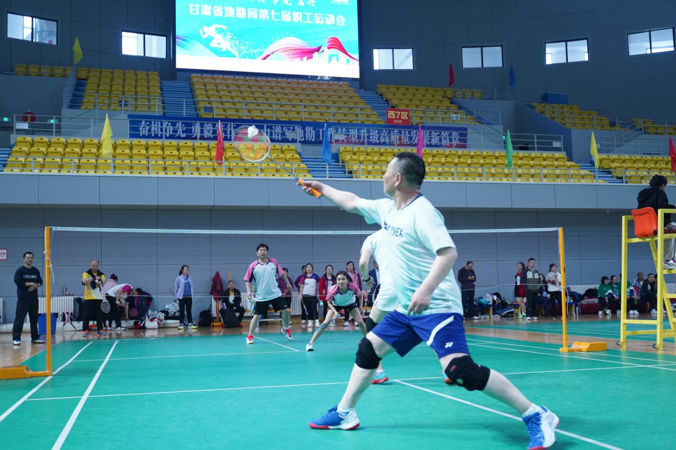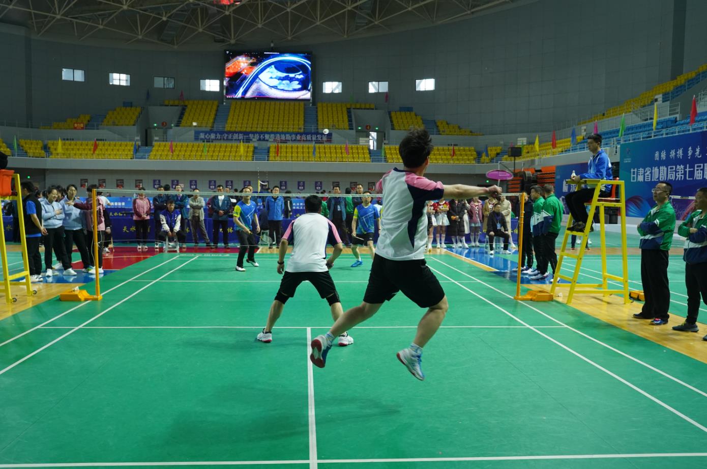 下午,羽毛球个人赛男女混合双打、男子双打、女子双打同时进行。经过激烈比拼,天水矿勘院卢娟、吴东成获得男女混合双打冠军,局机关于淑晶、刘卫东获得亚军,张掖矿勘院张瑞雪、高祥获得季军;男子双打比赛,天水矿勘院李峰、郑固刚,局机关欧勇、王峰,兰州矿勘院屈跃红、王旭东和白银矿勘院杨锐、崔斌晋级半决赛;女子双打比赛,兰州矿勘院李爱平、马娟,白银矿勘院屠慧、郭晓霞,张掖矿勘院陈静、成凌青和天水矿勘院李明月、刘瑜联袂入围半决赛。