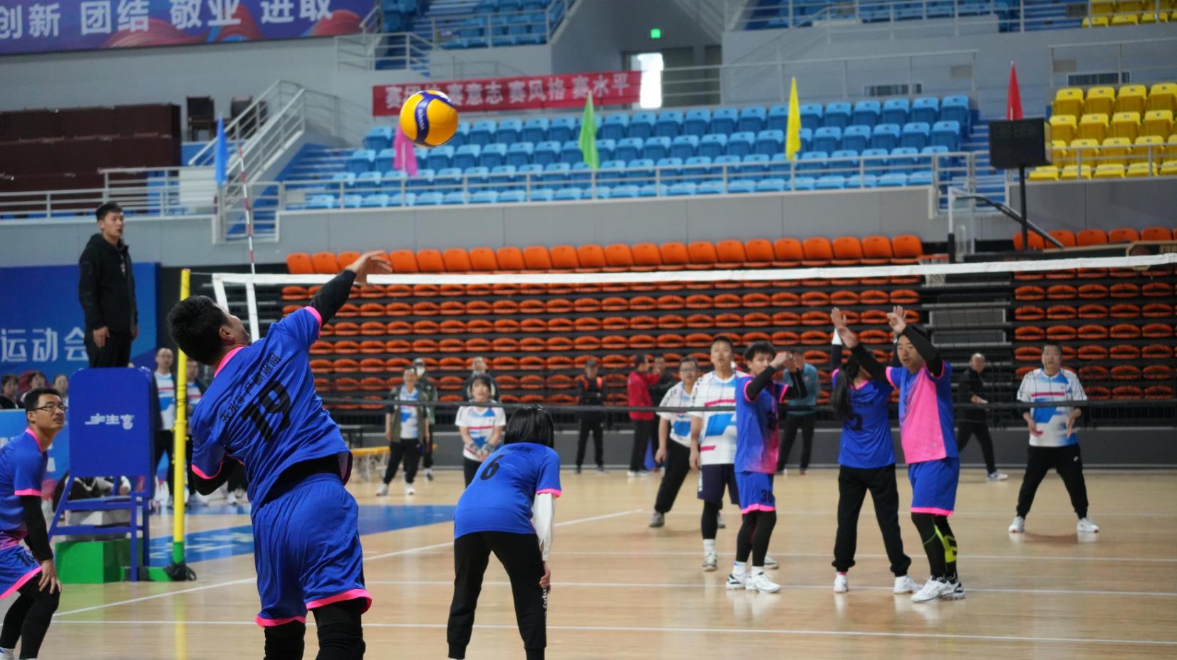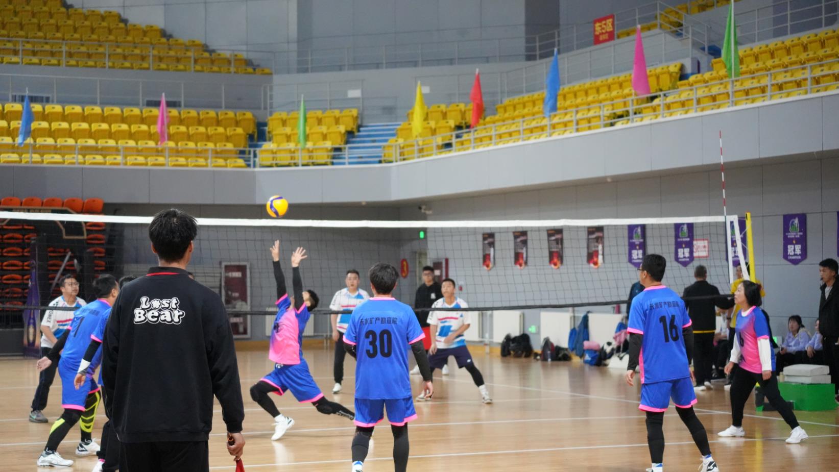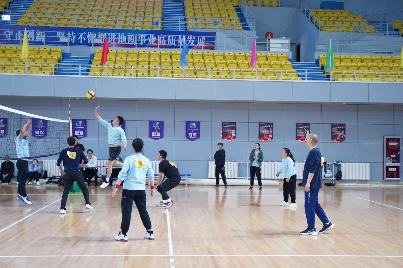 随后登场的张掖矿勘院与地调院为荣誉而战。地调院一改前两场颓势,凭借强有力的发球,不断冲击着张掖矿勘院的一传,使得张掖矿勘院接连出现失误,比分逐渐拉开,地调院以大比分2-0取得胜利。