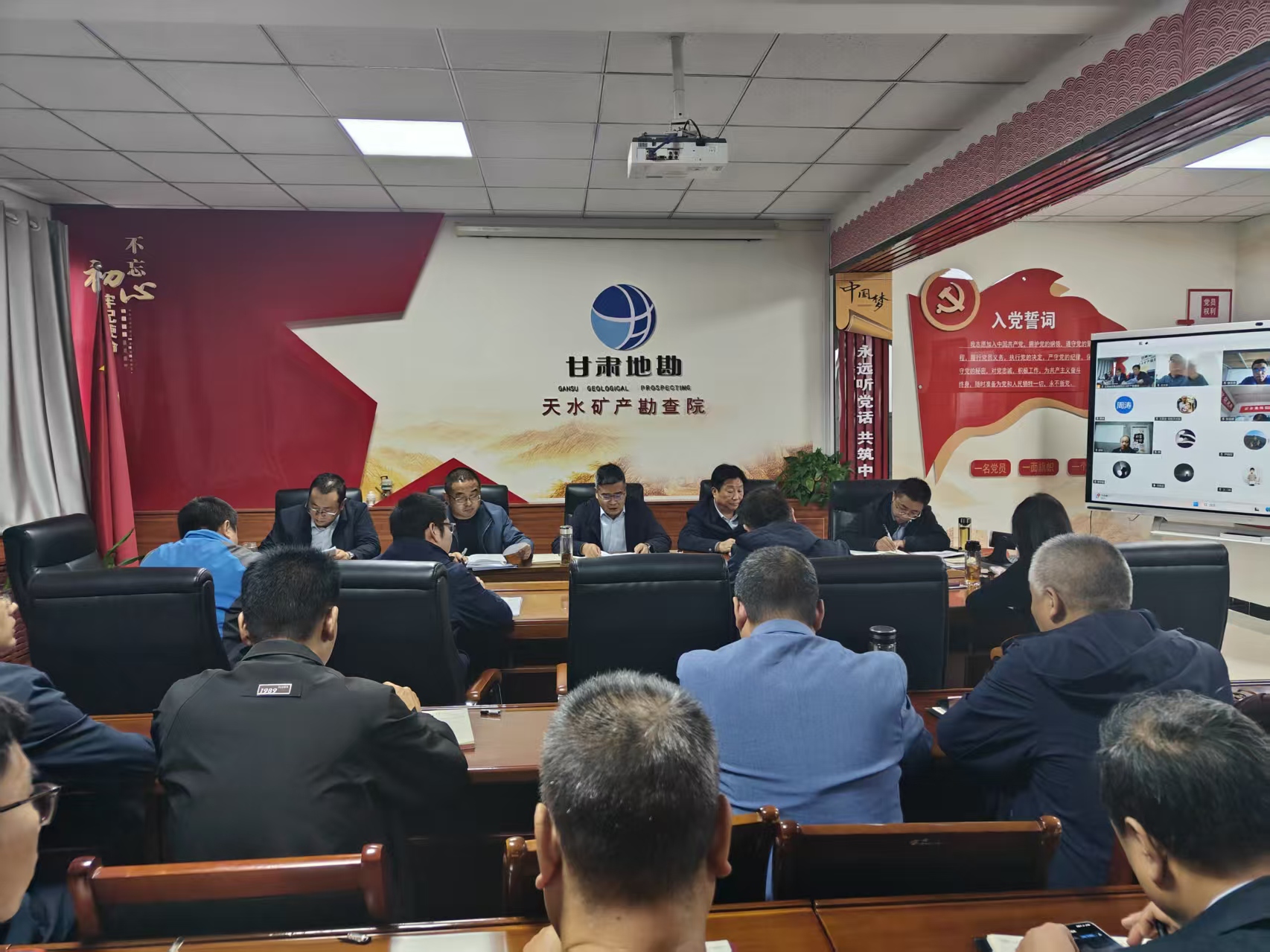 院班子成员、各部门负责人现场参会,野外项目负责人通过视频连线同步参会。