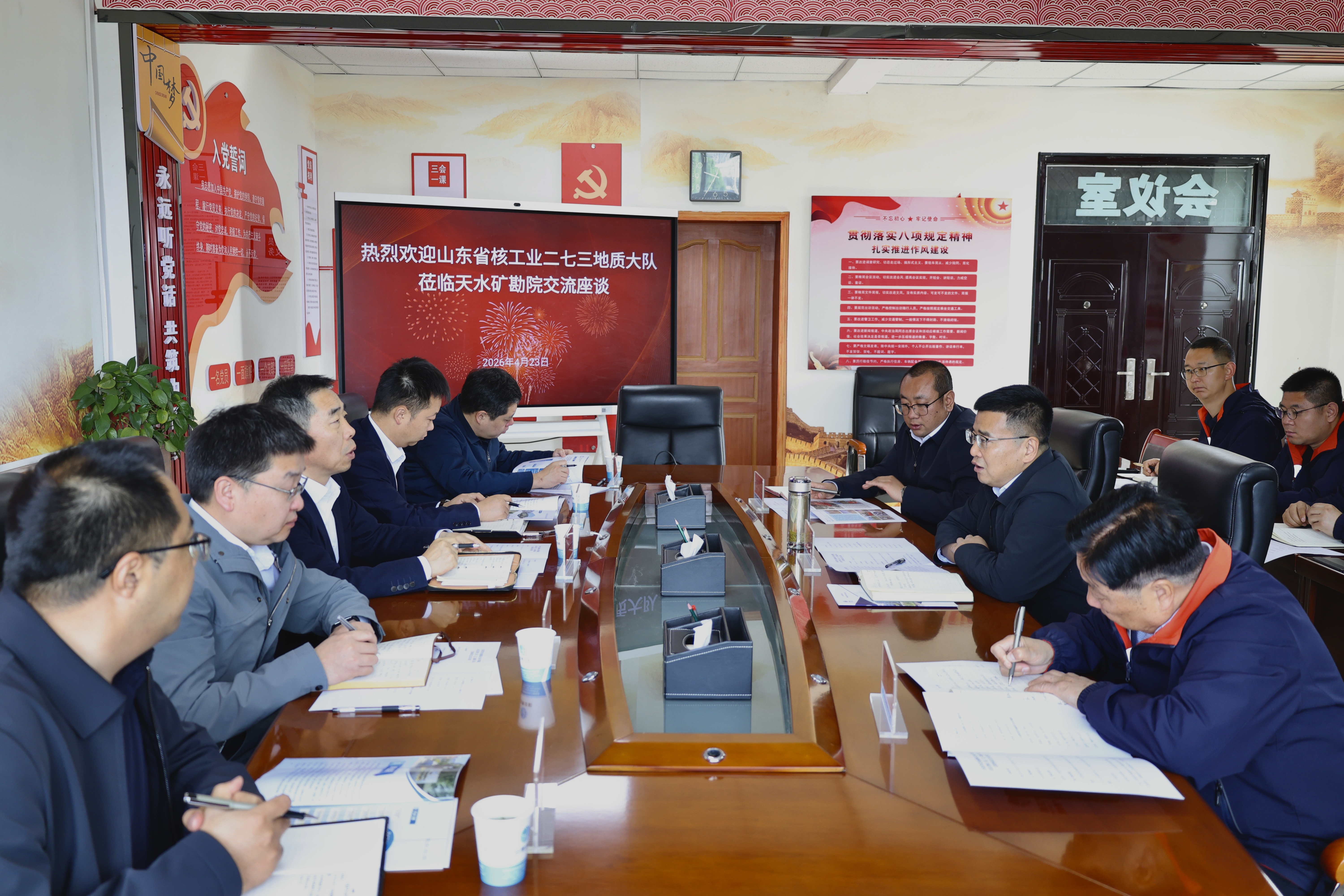 4月23日,山东省核工业二七三地质大队党委书记、队长戴长国一行到天水院座谈交流,畅谈务实合作,共谋长远发展。党委书记、院长侯军林主持会议。